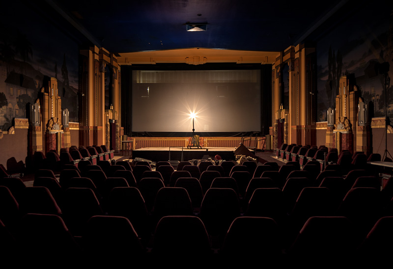 The “ghost light” is a theater tradition. When a theater is vacant, a single light is left burning in the darkened, silent space. In classic form, the ghost light is on stage, an exposed bulb on an elevated light stand. During the pandemic, artist Sara Jane Boyers has been visiting vacant theaters across Southern California making photographs by ghost light.