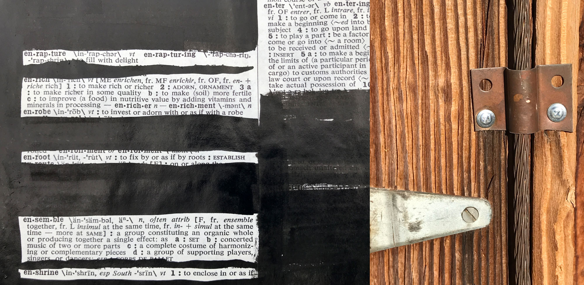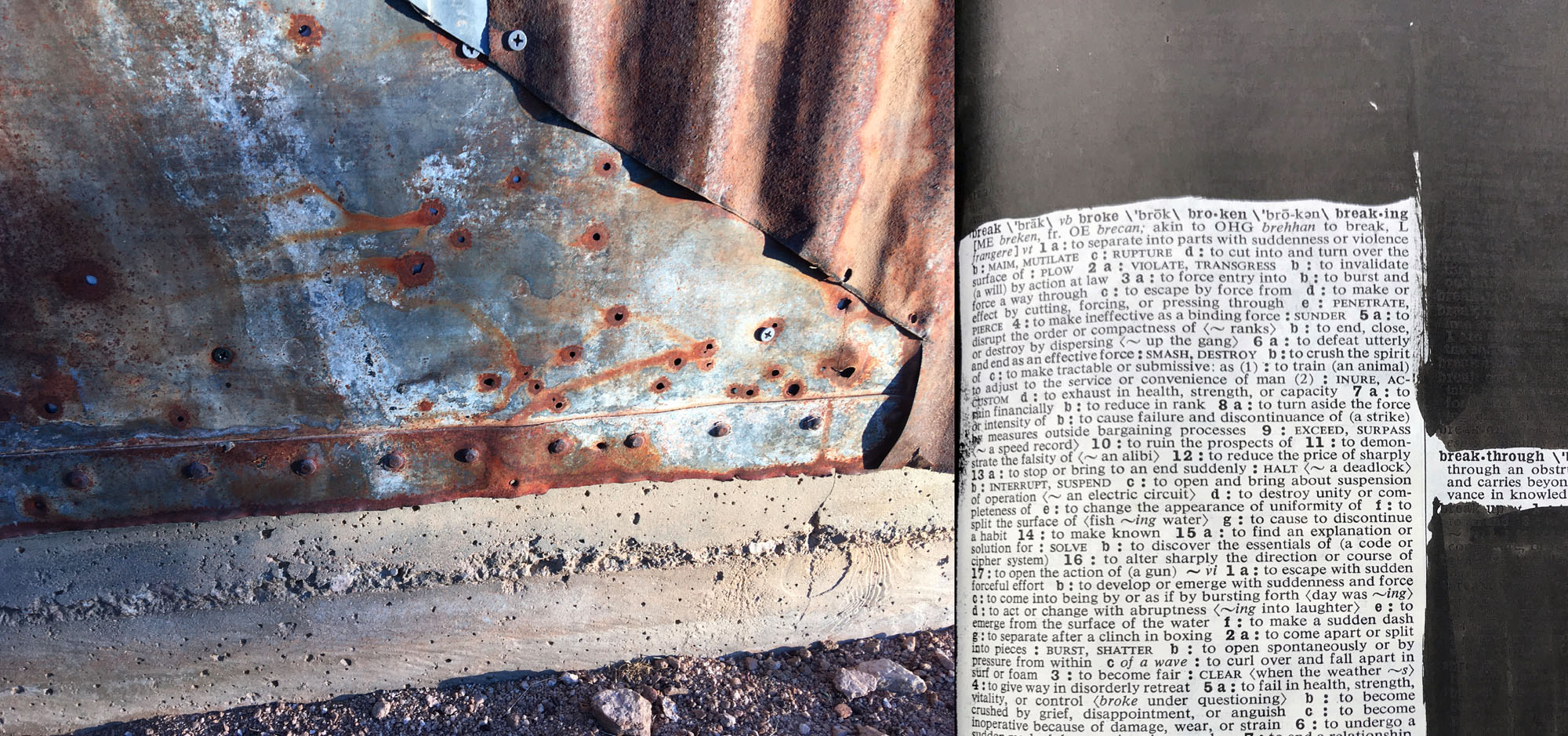 Psychic Protectors documents two rituals the collaborative team has performed for many years and which have accelerated in this year of plague: altering the “Mystery Ranch” studio in the Eastern Mojave and inking the Webster’s Seventh New Collegiate Dictionary. The studio upkeep is part ritual, part repair. The devotional dictionary inking focuses on “choosing what seems important, a meditation on seeking and finding knowledge.” Results of the two ritual actions are presented together in photo collages. The goal is to move forward in an era of confused crisis. “At times we are at a loss of what to do. But each day we can do a little something; we maybe can’t affect the entire system in a meaningful way, but we can affect our own microcosm of it, and our own understanding of it.”